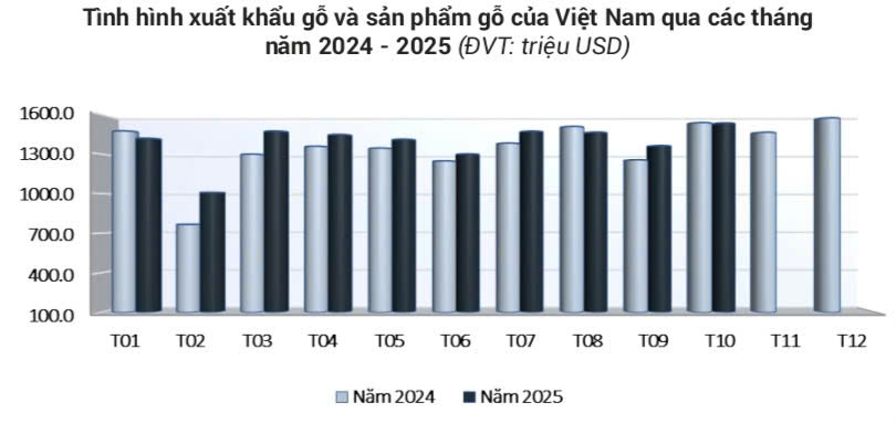 Lũy kế 10 tháng năm 2025, xuất khẩu gỗ và sản phẩm gỗ đạt 14 tỷ USD, tăng 6% so với cùng kỳ năm 2024, riêng xuất khẩu sản phẩm gỗ đạt 9,6 tỷ USD, tăng 5,2% so với cùng kỳ năm 2024.